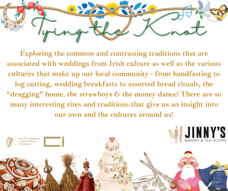 Sharing details of “Tying the Knot” – exploring song, bread and wedding traditions of Ireland and our local international community, in conjunction with Jinny’s Bakery & Tea Rooms, Drumshanbo.