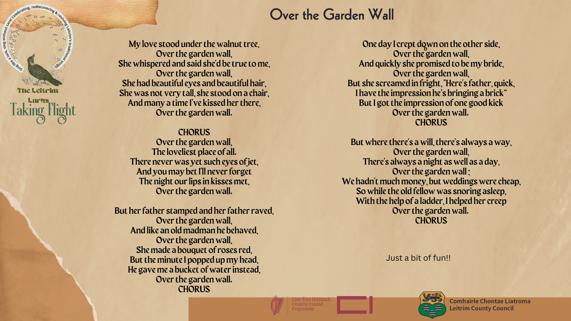 Sharing songsheets & sing-along recordings of the local songs shared at each “Lend an Ear” session in the “Taking Flight” series, which is supported by Leitrim County Council and Creative Ireland.